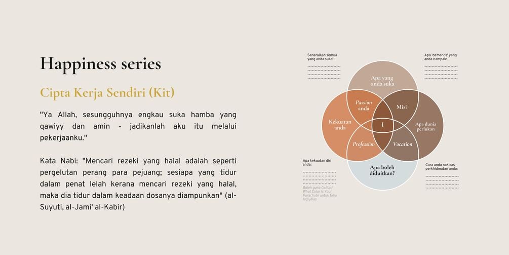 Kit ini adalah adaptasi Ikigai - konsep 'being' daripada tradisi Jepun. Semasa saya baru habis graduasi (2006), senior saya saudara Wan Aimran ada kongsikan ikigai ini dan telah bantu saya sejak itu, membina kerja sendiri.